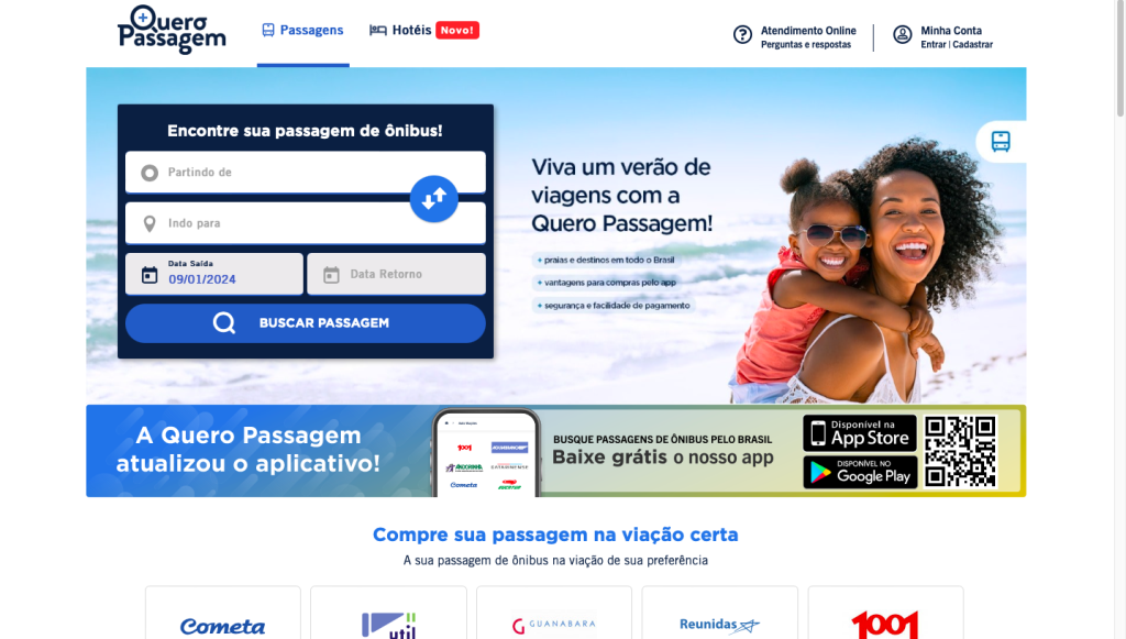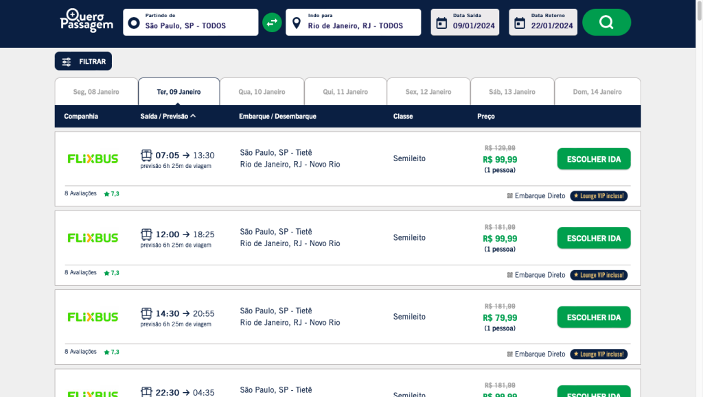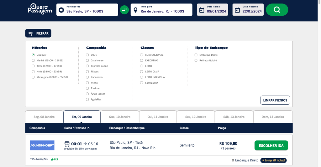Ao acessar a Quero Passagem, o viajante poderá encontrar passagens disponíveis, viações filiadas, além de escolher assentos e efetuar a compra via PIX ou cartão de crédito.