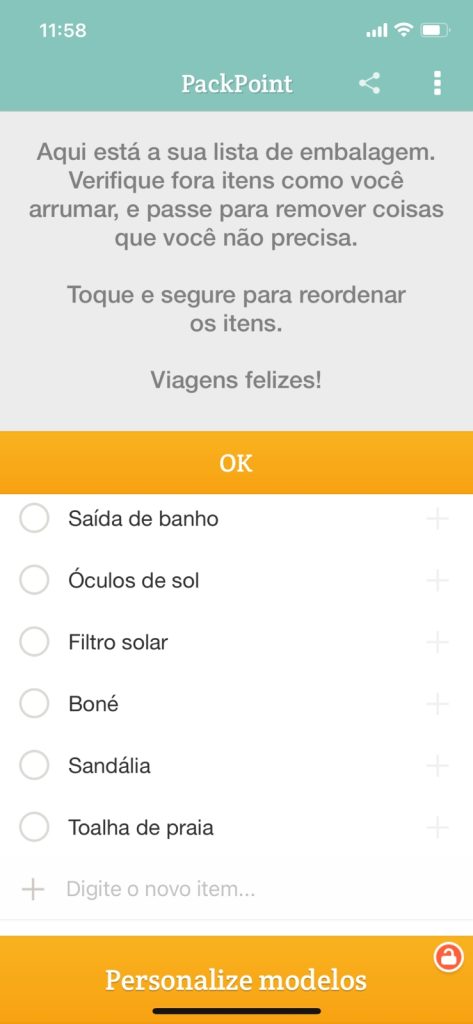 O aplicativo PackPoint é ideal para você que está precisando fazer a sua Mala de Viagem, mas não quer esquecer nada. O mesmo irá te ajudar a escolher os itens ideais para o destino em questão. Além disso, também irá informar até a quantidade de cada item.