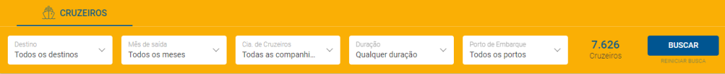 Neste caso, é só informar o destino desejado, mês, companhia de cruzeiros, duração da viagem e ponto de embarque, além de clicar em “Buscar”.
