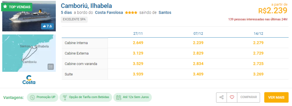Em seguida, uma nova página se abrirá e você poderá conferir todos os detalhes do cruzeiro. Como, por exemplo, a duração da viagem, o preço de cada cabine e alguns dos serviços oferecidos.