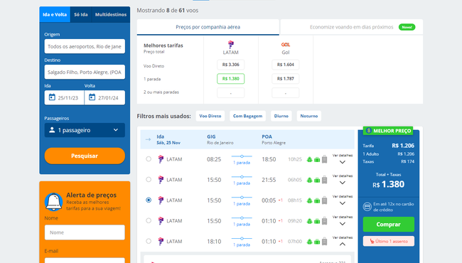 Na hora de comprar, confira os preços, do mesmo trecho, em outras companhias aéreas e parcele sua compra com o cartão de crédito. O cliente ainda pode contar com o Seguro Viagem.