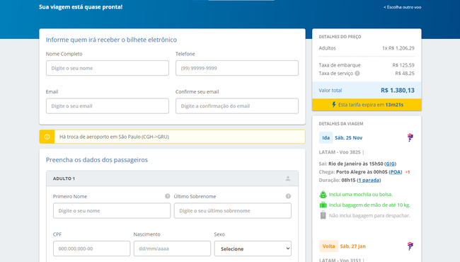 • Na tela seguinte, informe seus dados (dados de quem irá receber as passagens e os dados do passageiro);