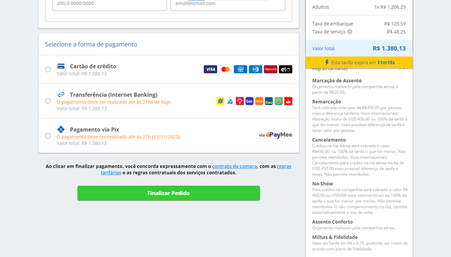 Depois de informar seus dados pessoais, o cliente irá precisar informar a forma de pagamento dos bilhetes. Nessa plataforma, é possível pagar: