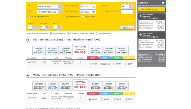 - Os resultados aparecerão na tela seguinte. Aqui, você pode conferir todas as passagens disponíveis e detalhes dos preços. Para prosseguir, é preciso escolher o dia escolhido e o tipo de tarifa das passagens. Depois, clique no botão “Próximo”;