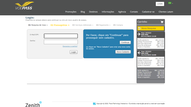 - Entre na sua conta da Voepass. Caso não tenha uma, é possível continuar sem fazer o cadastro. No caso, clique em “Continuar”;
