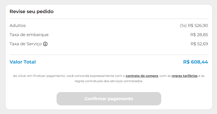 No final da página, você também pode revisar o seu pedido, com os detalhes sobre a passagem e o preço. Após conferir todos os detalhes, basta clicar no botão “Confirmar pagamento”.