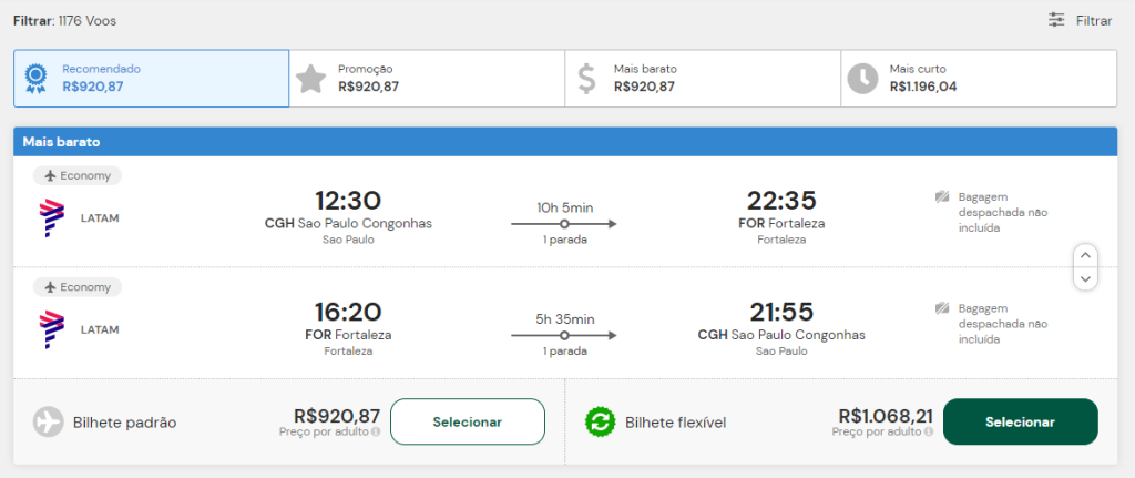 Ao longo da página, a empresa indicará quais são os melhores voos de acordo com algumas características, como, por exemplo, menor preço e menor duração.