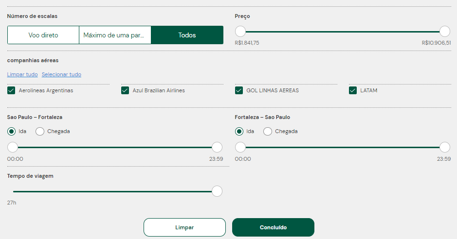 Ao clicar nessa opção, você poderá escolher detalhes, como, por exemplo, uma determinada companhia aérea, o número de paradas do voo, a faixa de preço, o tempo de viagem, além do horário de partida e chegada.