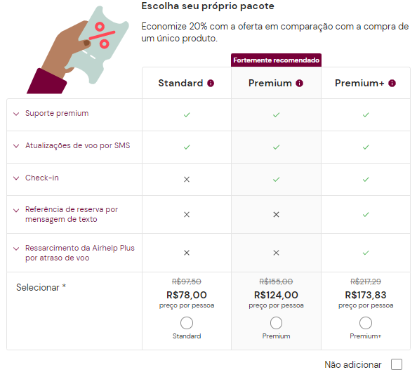 Então, basta selecionar as opções que você deseja e caso você não queira nenhum dos pacotes oferecidos, é só clicar em “Não adicionar”.