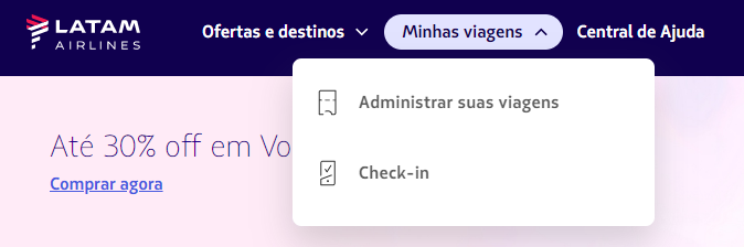 • No menu superior do site, clique em “Minhas viagens” e depois em “Check-in”;