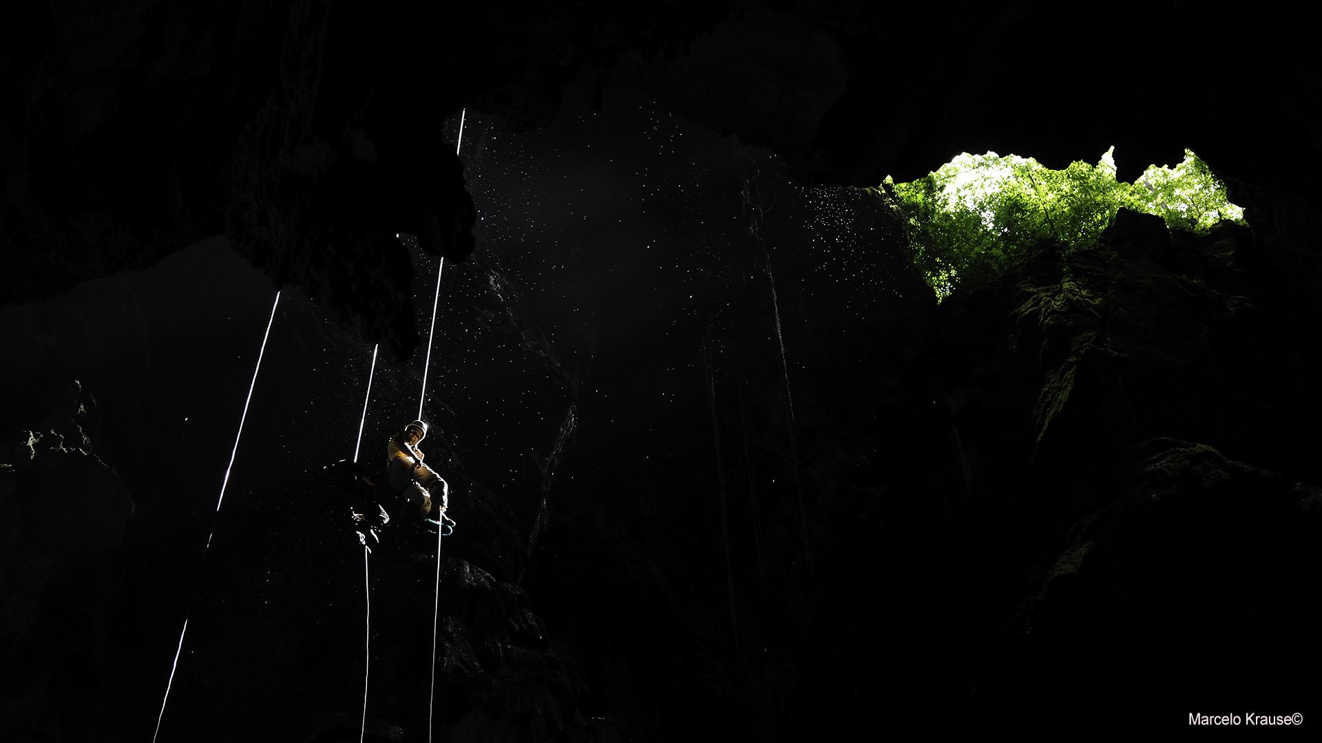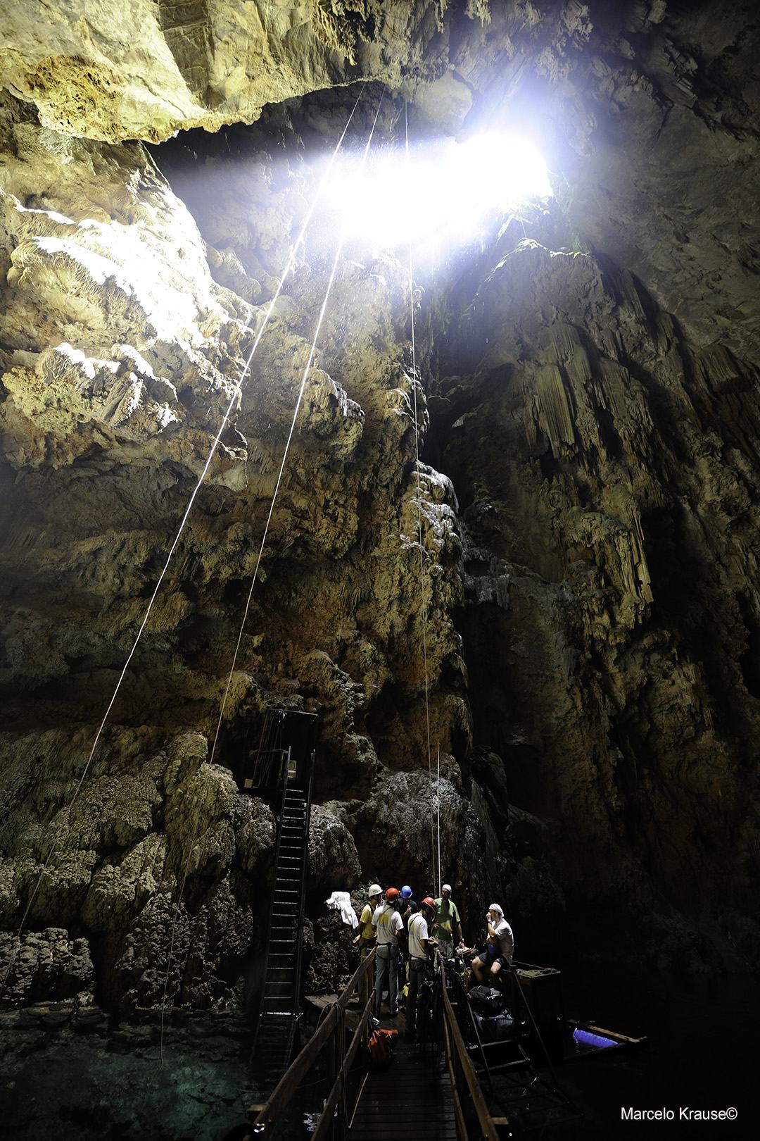 Olhando de cima, se vê apenas uma pequena fenda no chão, mas com a descida de Rapel, a descida vertical até o fundo da caverna é de 72 metros, o que equivale a um prédio de 26 andares.